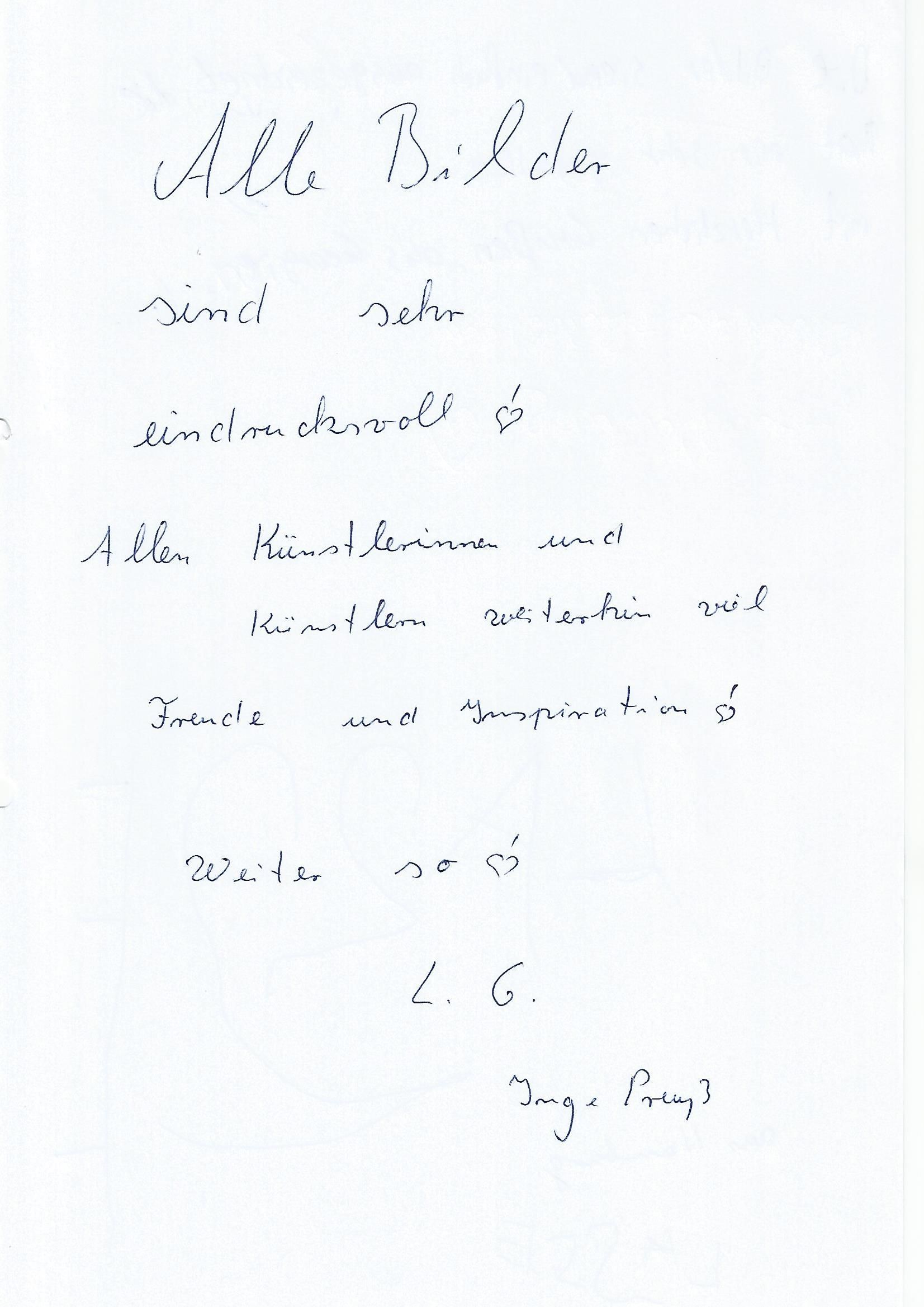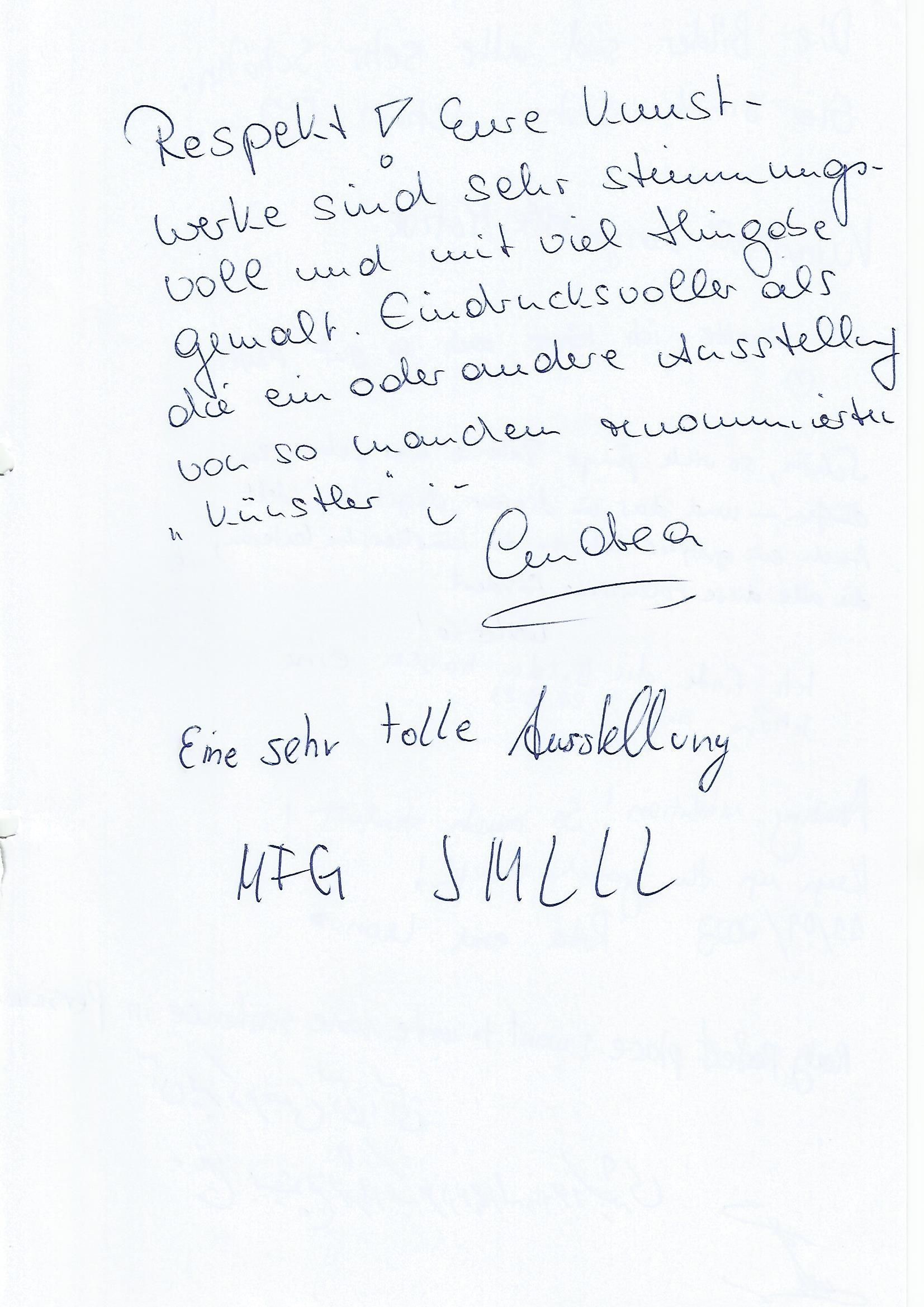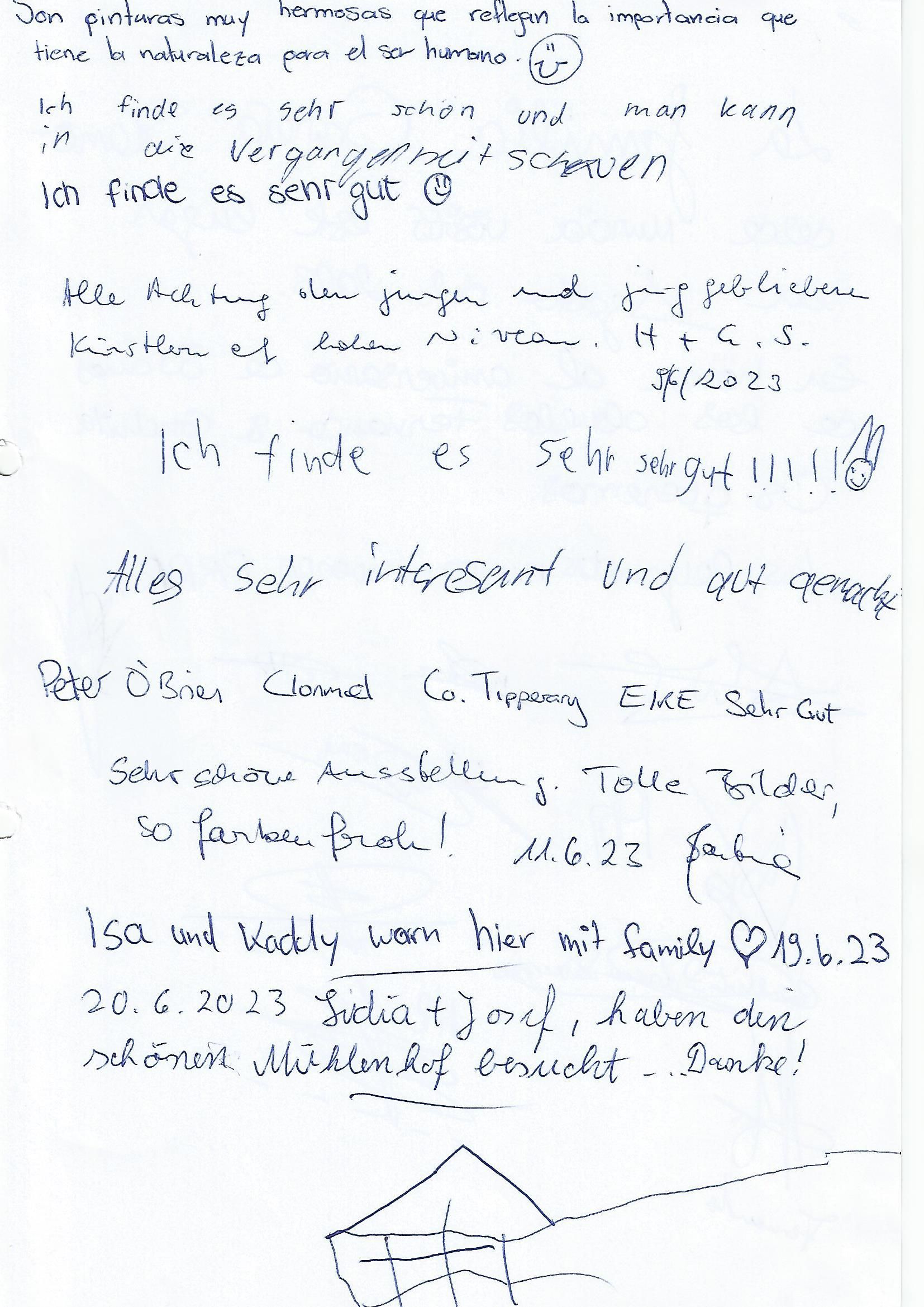 Dankbar bin ich für die Begegnung mit interessanten Menschen im Webers-Kotten und dafür, neue Schüler zu gewinnen, die von unserer Ausstellung inspiriert waren. Allen BesucherInnen meiner Ausstellung "Mühlenhof-Träume" möchte ich auf diesem Weg meinen herzlichen Dank sagen. Ich hoffe, Sie beim nächsten Mal wieder auf dem Mühlenhof begrüßen zu dürfen.