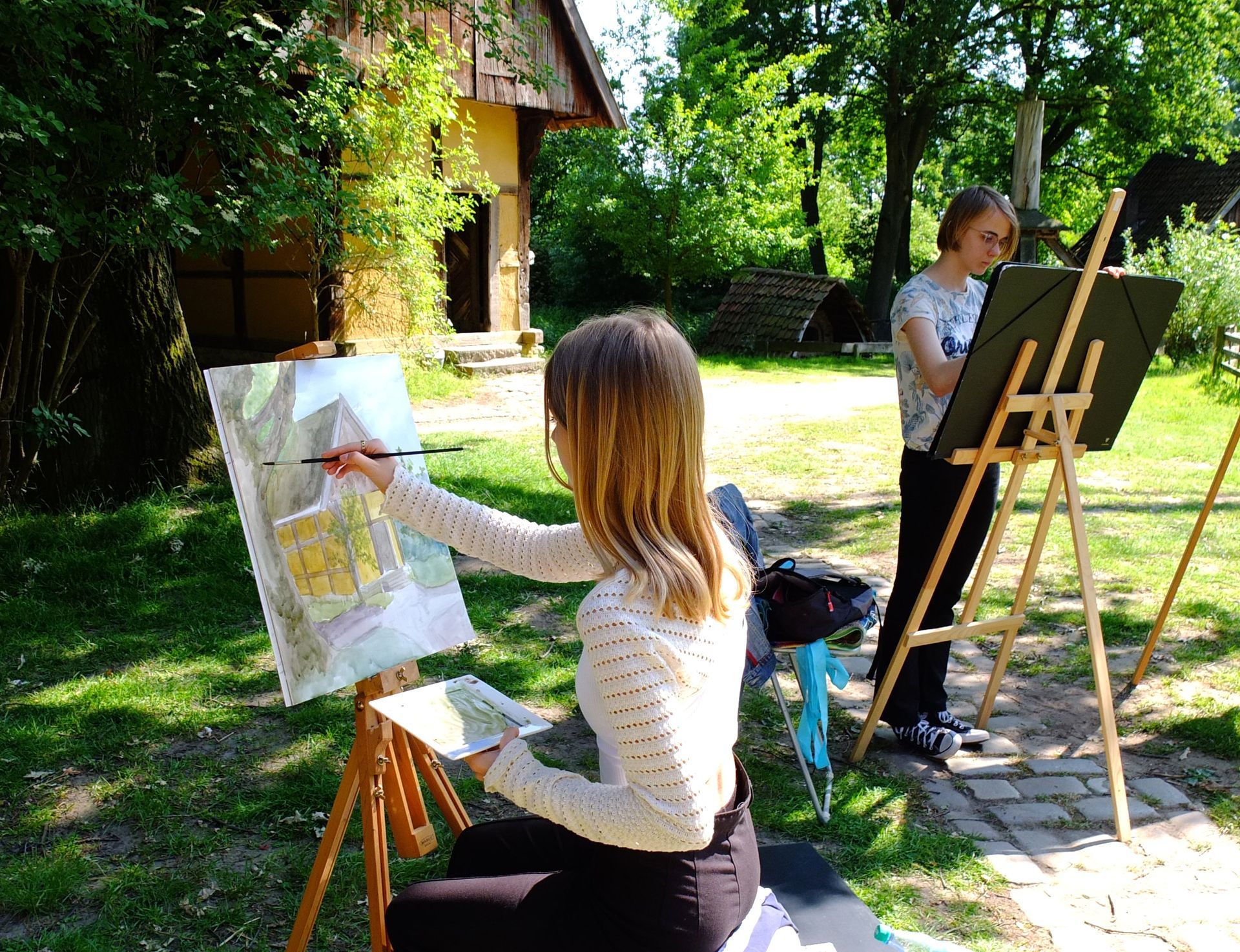 Einige der jungen Künstlerinnen und Künstler verbrachten dort ihre schulfreien Tage mit Pinsel und Farbe, um die besondere Atmosphäre des Freilichtmuseums einzufangen. So entstanden beeindruckende Ansichten der historischen Bockwindmühle, der Zichorienmühle und anderer Gebäude – ebenso wie liebevolle Porträts der neuen Bewohner des Museums, eines Paares weißer Pfauen.